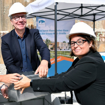 Münchenstift-Geschäftsführer Siegfreid Benker und die Leiterin des Hans-Sieber-Haus, Ana Thudt, bei der Grundsteinlegung für den Neubau