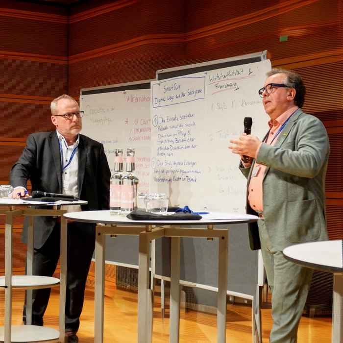 Das Sozialgesetzbuch kernsanieren – mit dieser Forderung konfrontieren Pflegeanbieter und Vertreter der Verbände auf der Netzwerkveranstaltung "Contec Forum" in Berlin Martin Schölkopf (links). Er ist Leiter der Abteilung Pflegeversicherung beim Bundesgesundheitsministerium und mahnt: Es gebe nicht das eine Patentrezept, mit dem alles funktioniere. Darum gehe es auch nicht, hält ihm Ulrich Christofczik (rechts), Geschäftsführer der Evangelische Dienste Duisburg, entgegen. "Aber fangen Sie doch endlich mal an."