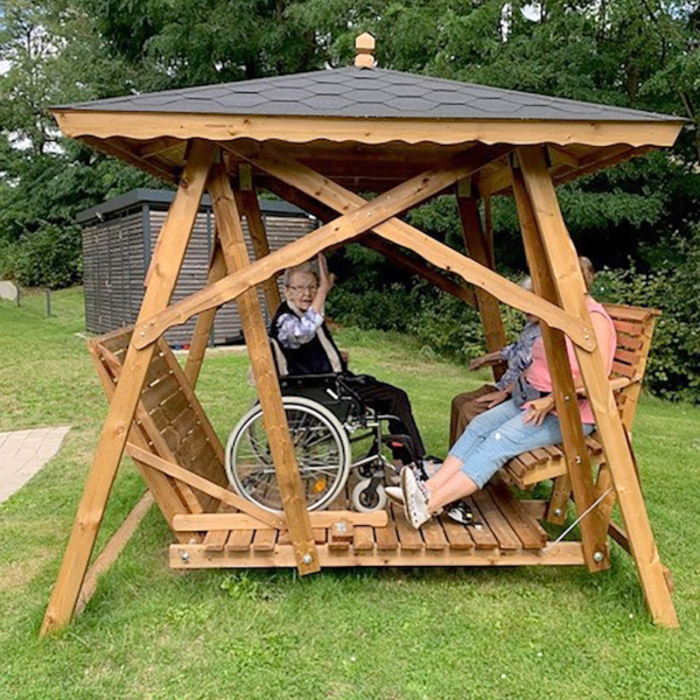 Das jetzige Sommerwetter ist wieder eine Phase, in der die Rollstuhlschaukel im Garten der Caritas-Einrichtung in Lünen dauerhaft zum Einsatz kommt. Dann sitzen sich in der drei mal drei Meter großen Holzkonstruktion wieder ein Bewohner des Hauses und eine Betreuungsperson gegenüber und schaukeln. Der Bewohner sitzt im Rollstuhl, der Betreuer auf der Sitzbank gegenüber. Ein wenig Bewegung, die den Senioren guttut.