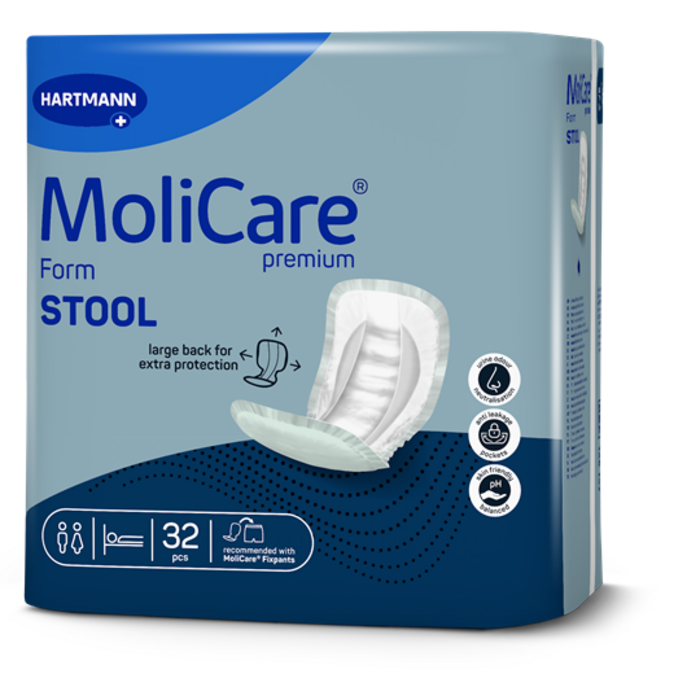 MoliCare® Premium Form STOOL ist geeignet zur wirtschaftlichen Versorgung bei Stuhlinkontinenz und auch eine gute Empfehlung bei Durchfall sowie für stuhlinkontinente Personen mit Harnblasenkatheter. Die grüne, textile Rückseite erlaubt jederzeit eine einfache Unterscheidung von Vorlagen für eine Harninkontinenz. Selbstverständlich bietet das in Deutschland hergestellte Produkt den von MoliCare® bekannten aktiven Hautschutz mit einem pH-hautneutralen Wert.