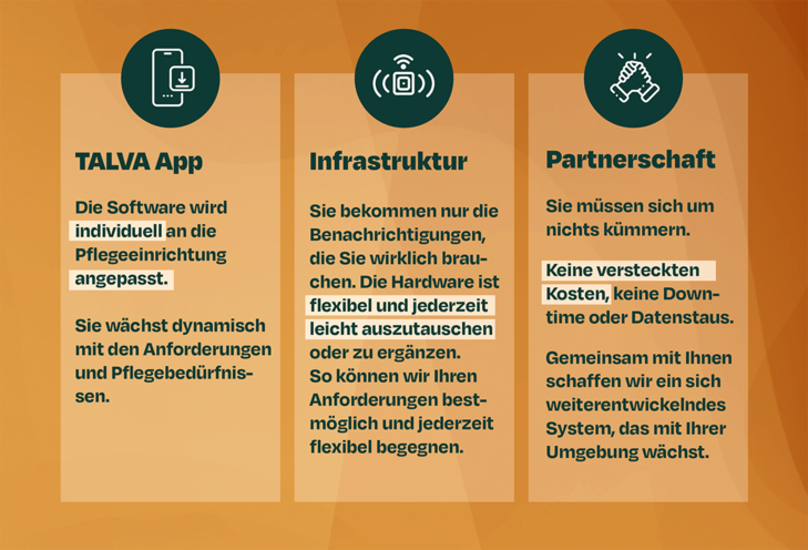 Herzstück der Technologie ist die App TALVA, die alle sensorisch gesammelten Informationen zusammenführt und in Echtzeit überträgt. Sie lässt sich nahtlos in bestehende Arbeitsprozesse integrieren und gibt Pflegekräften die Entlastung sinnbildlich in die Hand. Aktuelle Datenschutzstandards werden dabei natürlich immer eingehalten.