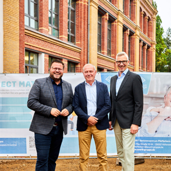 Über großes Interesse an der Baustellenparty des Azurit-Seniorenzentrums Pfefferkorn freuten sich Oberbürgermeister Lars Kluge (links), Reinhard Lindner von Lindner Bau (Mitte) und Azurit-Geschäftsführer Markus von Puttkamer (rechts)