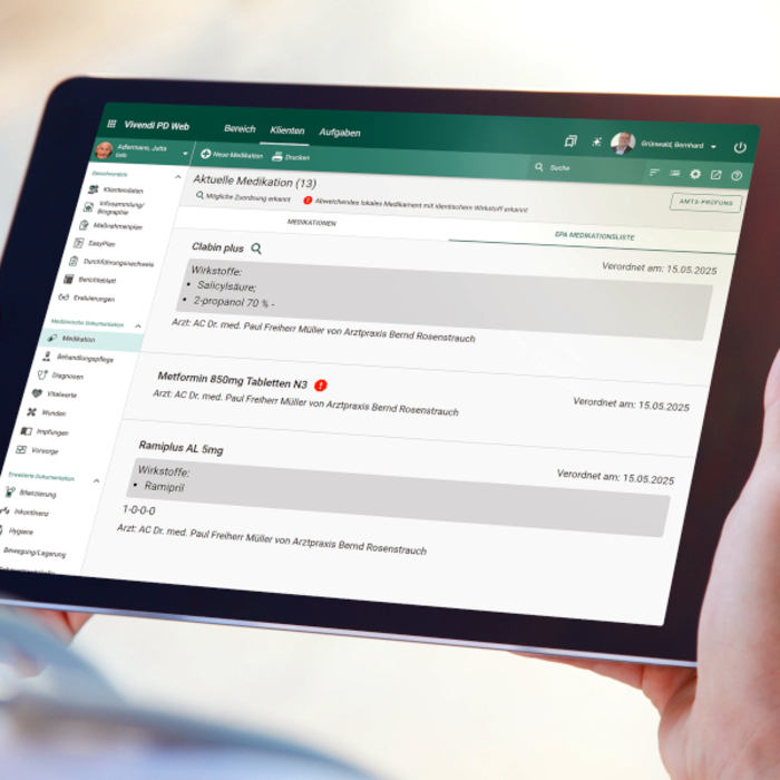 Mit dem aktuellen Update auf die Version 25.6 bietet Vivendi seinen Nutzern eine zertifizierte und praxistaugliche Lösung zur Nutzung der ePA im Pflegealltag. Durch die direkte Anbindung entfällt der bisher übliche Medienbruch. Informationen zu Medikamenten, die von Krankenhäusern, Hausärzten oder Apotheken eingetragen wurden, stehen den Pflegekräften somit direkt im System zur Verfügung.
