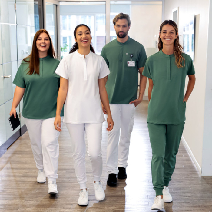 Das spezielle Care-flex-Gewebe aus recyceltem Polyester und Viskose auf Holzbasis vereint die funktionalen Eigenschaften von Sportbekleidung mit der hohen Qualität von Berufsbekleidung. Das Material ist atmungsaktiv, hygienisch waschbar bei 60 Grad, schnell trocknend, knitterarm und bügelfrei. Zudem fühlt sich der Stoff angenehm weich auf der Haut an.