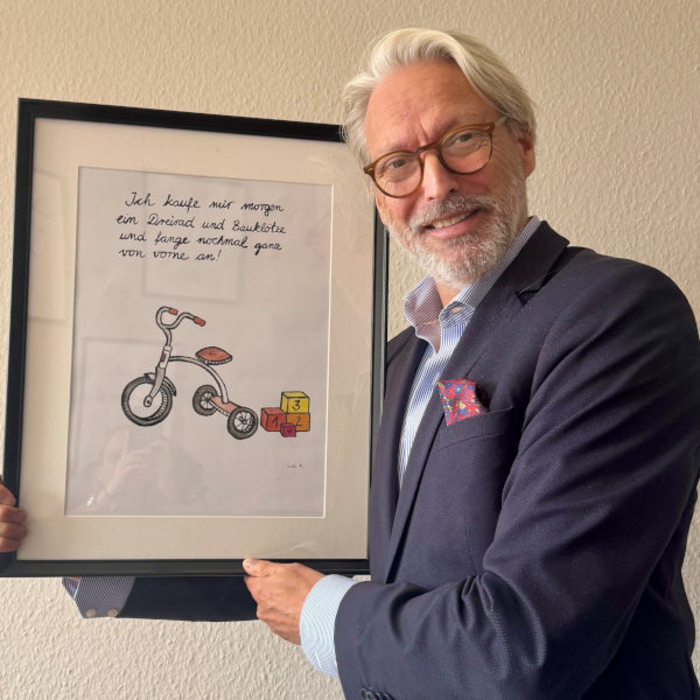 Cito Aufenacker in seinem Büro mit dem Bild, von dem er sagt, dass es ihn jeden Tag daran erinnere, täglich neu zu denken und vor allem: nicht alles allzu ernst zu nehmen