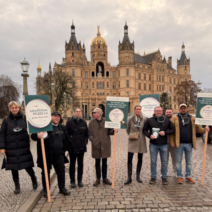 Der Verein "Zukunftsfeste Pflege" in Mecklenburg-Vorpommern hat am Mittwoch, 10. Dezember, für eine verbindliche Finanzierung von ambitionierten Pflegekonzepten mit Verweis auf die Bund-Länder-AG vor dem Schloss Schwerin demonstriert (Foto). "Es fehlt an klaren politischen Entscheidungen und verbindlicher Finanzierung – die Konzepte drohen sonst nur leere Hüllen zu bleiben", sagt Geschäftsleiter Martin Mengel. Der Verein hat durch seinen Pflegegipfel im Mai, zu dem auch Pflegeexperte Thomas Klie und Sozialministerin Drese (per Videobotschaft) kamen, in der Branche Bekanntheit erlangt. Zukunftsfeste Pflege