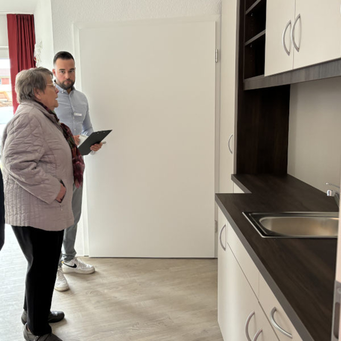 Humanas-Kundenreferent Daniel Schmidt zeigt einer Besucherin am "Tag der offenen Wohnparktür" die Einzimmerapartments